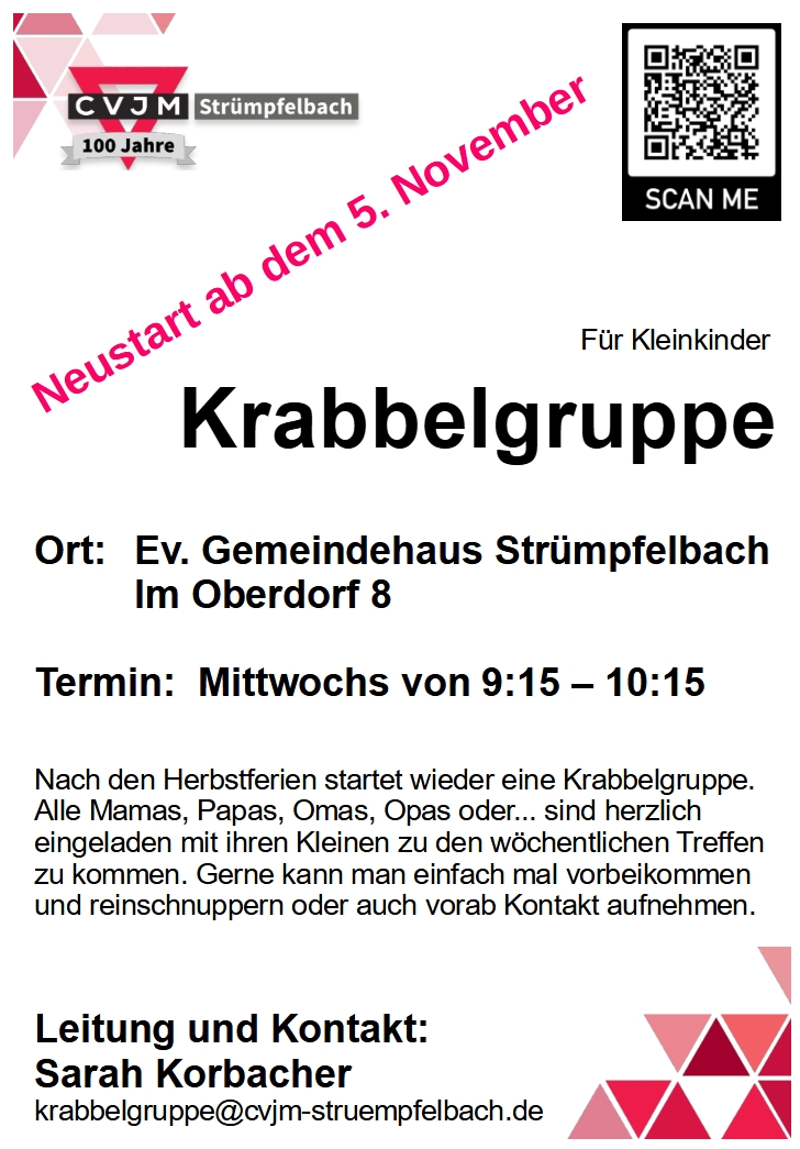 Wir freuen uns sehr, dass Sarah Korbacher sich bereit erklärt hat, wieder eine Krabbelgruppe ins Leben zu rufen!!! Diese findet immer mittwochs von 9:15 bis 10:15 im großen Saal des Gemeindehauses statt. Wir würden uns sehr freuen, wenn noch das eine oder andere Kind im Krabbelalter in Begleitung (Elternteil, Großelternteil,...) dazustoßen würde. Bei Interesse einfach Sarah Korbacher mal ansprechen oder über die E-Mail-Adresse unten kontaktieren.